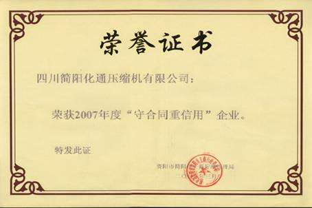 公司日前被資陽市簡陽市工商行政管理局評為2007年度“守合同重信用”企業(yè)。